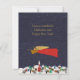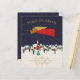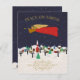 Den här budgeten innehåller ett julkort som flyger över en by vid jul kväll och spelar ett musikinstrument. Texten i faux guld typography lyder "Fred på jorden". Nedan står ditt namn för att anpassa dig. Kortets baksida har en hälsning som du också kan anpassa. Designad av konstnären ©Susan Coffey.