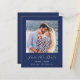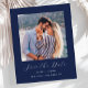 Det här enkla, minimalistiska Spara datumkortet innehåller ett fyrkantigt foto ovanför orden "Spara datum" i ett vitt handskriftsskript i elegant, följt av parets namn, bröllop datum och stad i sans serif-teckensnitt på en marin blå bakgrund. Lägg till ett mer detaljerat meddelande med ytterligare information om det omvända.