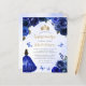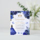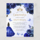 Den här vackra quinceañera-inbjudan har en gräns av royal blue ro på blå vattenfärgsbakgrund. En guld tiara, en mörk i royalets blå prinsessa-klänning och små blå fjärilar dekorerar texten. Ord "Quinceañera" och hedersgästens namn visas i handskriftsskriptet för guld-färgad i elegant, med den återstående texten i grått sans serif-teckensnittet.