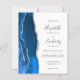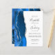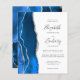 Den moderna bröllopsinbjudan från elegantens lämnat kant innehåller ett royal blått vattenfärgsagat gräns som trimmas med faux silver glitter. Anpassadet kombinerar handskrift, tryckplåt och kursivt typsnitt i grått i kol mot vit bakgrund. Den omvända sidan har en matchande royal blue och silver agate-design.