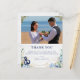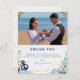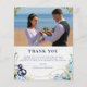 Budgetera fotot bröllop tack för ditt kort. Rustik utformning av ett bröllop mellan nautisk inslag (marinankare, knut, stjärnfisk och blekt trä) och vackra buketter av blommigt av blåväghaj, och vita anemonblommor, eukalyptus löv, dahlia och greenery. Perfekt för strandbröllop, nautisk bröllop, destinationsbröllop, sommar bröllop.