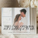 Vårt vykort i bröllop spara datum har ett modernt handskriftsskript på förlovningens foto.