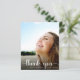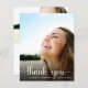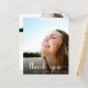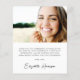 Ett budgetvänligt tack från studenten med ett kort som visar student överlagrad med "tack" i ett vitt skript i snyggt med slagord och deras namn och klassår i modern vit typografi. På motsatt sida lägger du till ytterligare ett foto, anpassar ett tackmeddelande och lägger till namn i ett namnteckning skript.