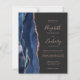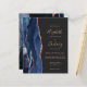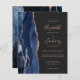 Den moderna bröllopsinbjudan från elegantens lämnat kant har en marin blå vattenfärgsagat gräns som trimmas med faux ro guld glitter. Anpassadet kombinerar handskrift, tryckplåt och kursivt typsnitt på mörk med grått-bakgrund för kol. Den omvända sidan har en matchande marin blå utformning och ro guld-agatdesign.