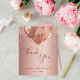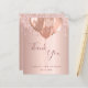 Ett tack för en 18:e (eller vilken ålder som helst) födelsedag. En ro guld-faux-metall tittar bakgrund färg. Med faux glitter-droppar, färgdroppstift och ballonger. På framsidan av stora mörken med färgaden ro skrev man skript och texten: Tack, text, titel och datum. Tillbaka: Mall för tackkort och namn.