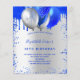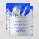 En faux silver tittar bakgrund. Dekoreras med royalets blå faux glitter droppar färgdroppstift, gnistor och ballonger. Anpassa och lägg till information om namn och party. Namn är skrivet med ett handskript i stil.