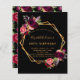 På framsidan: En inbjudan till en 40:e (eller någon ålder) födelsedagsfest. En svart chic med faux guld geometric ram. Dekorerad med mörk burgundy och rosa blommor, ro och boho stil fjädrar. Anpassa och lägg till information om namn och party. Namn är skrivet med ett handskript i stil, Gulden färgad brev. Bakåt: Svart bakgrund och stort ro i burgundi och lila.