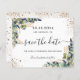 Ett trendig Spara datum för en 40:e (eller någon annan ålder) födelsedagsfest. En snyggt vit bakgrund som dekorerats med eukalyptus, grönt, guldblad och faux guld glitter stoft. Anpassa och lägg till datum, namn och text. Texten: Spara datumet skrivs med ett stort trendig-handskript i stil med dekortecken.
