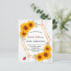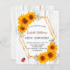För en 50:e (eller någon ålder) födelsedagsfest. En rustik vit träbakgrund, som dekoreras med solblommor. Ett faux guld geometric ram och en söt röd ladybug. Anpassa och lägg till information om namn, ålder och party på framsidan.