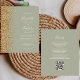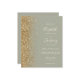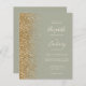 Den lämnat kant i eleganten är en modern bröllopsinbjudan från guld i glitter gräns. Anpassadet kombinerar elfenbenshandskrift, tryckplåt och kursivt typsnitt mot bakgrund av en grönt. På baksidan finns utrymme för information om bröllop på en solid sage grönt-bakgrund, tillsammans med en QR-kodgäst som kan söka på webbplatsen och OSAN.