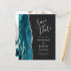Den vänstra kanten på detta eleganta moderna bröllops kortsidor med förhandsbesked har en tealblå akvarellagat kant med falskt silverglitter. Den anpassningsbara texten kombinerar silvergrå handskrift, kopparplåt och kursiva teckensnitt på en mörk bakgrund. Ersätt enkelt exempelbilden på baksidan med ditt eget vertikala foto.