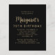 På framsidan av denna 70:e födelsedagsinbjudan finns den hederlige gästen med en textövertäckning av guld-färgaden. Uttrycket "hej 70!" visas i kalligrafiskript för elegant guld-färgad, följt av gästen för hederets namn och födelsedag i sans serif font. Med en mörk skärm kan du göra så att texten visas. Anpassa den omvända sidan med informationen om namn och party på en svart bakgrund. Ett underbart sätt att fira någon som blir sjuttio! (Obs! Kuvert inkluderas inte automatiskt i den här budgetinbjudan. Om du vill lägga till kuvert i din beställning användor du listrutan "Kuvert".)
