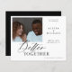 Modern minimalistisk enkel elegant, svart och vit bröllop spara datum BUDGET-kort till ett rimligt pris med chicen trendig "bättre tillsammans" för kalligrafi. +++++++++++ Enkel att anpassa med dina uppgifter! ++++++++++++++++++++++ LÄS DETTA INNAN DU KÖPER! Detta är ett budgetöverkomligt kort som är tryckt på ett pappert lakan (varje lakan har ett kort). ++++ För att få bästa prisa kvalitet rekommenderar vi att du väljer den pappra typen av halvglöd (det är tillräckligt tjockt för att kunna användas för kontorsprogram) ++++ Om du behöver kuvert väljer du alternativet ENVELOPE. +++ Dubbla-kontrollera all information och all stavning i texten eftersom du får exakt det du ser - ingen annan kommer att kontrollera någonting innan du skriver ut. +++ Detta kort är designat för storleka 4,5 x 5,6 tum. I fodral väljer du en annan storlek av kortet och texten går utanför sidan. Allt måste fixeras innan du lägger till produkten i kundvagnen. Be Live Design Service om hjälp.