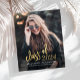 Modern studenten-avisering med ett foto av lodrät anpassningsbar. "Klassen of" i ord visas i guld faux foil-skriptet, följt av det redigerbara klassåret i guld-färgad open serif-teckensnitt. Lägg till student namn och skolan nedan i vitt sans serif-teckensnitt. Byt enkelt ut exempelbilden mot ditt eget student-foto. Med en svart övertoning i skärm kan du säkerställa att textpekarna visas. Baksidan är helsvart. Perfekt för högskoleexamen eller högskoleexamen.
