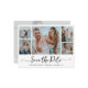 Budgeterat, modernt, minimalistiskt Elegant, Kalligrafi, skript 5 Photo Collage, spara postkort för datum i svartvitt. Den här delikata designen har 5 (5) rasterfotokollage, med en "spara datumet"-text i en vit, kursiv stil, med texten "svan", med texten "Skruva" i stil, eller med en typografi. Bakre fullt med övertäckning kan du lägga till information och information om bröllop. Enkel att anpassa den med dina uppgifter om bröllop och bilder.