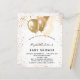 För en elegant Baby Shower, könsneutral. En vit chic bakgrund. Dekorerad med faux guld glitter, gnistor och ballonger. Anpassa och lägg till information om namn och party. Namn är skrivet med ett handskript i stil