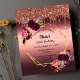 På framsidan: En inbjudan till en 50:e (eller någon annan ålder) födelsedagsfest. En grå övertoningsbakgrund med faux guld geometric ram. Dekorerad med mörkens lila och burgundblommor, ro och boho stil fjädrar. Faux bronze glitter droppar. Mallar för uppgifter om namn och party. Namn är skrivet med ett handskript stil, svart färgad brev. 1 lakan = 1 inbjudan tryckt kant till kant.