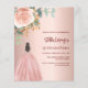 En modern, snyggt och glamorös inbjudan till en Quinceañera, 15:e födelsedagsfesten. En ro guld-bakgrund som dekorerades med ett stort ro, en flicka som bar en boll-gryning. Namn är skrivet med ett modernt handskript i stil. Anpassa och lägg till information om party. 1 lakan = 1 inbjudan tryckt kant till kant.