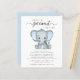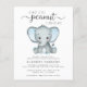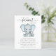 En söt och budgetvänlig duschinbjudan till virtuella pojke med "En söt liten jordnöt är på väg" skriven i en blandning av mjuk grått, modern typografi och snyggt, och en pastellblå vattenfärg av en baby-elefant. Anpassa namn och duschdetaljer i grått-typografi.