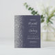 Den lämnat kant i eleganten är en modern bröllopsinbjudan från silver i glitter gräns. Med anpassadet kombineras handskrift av blek silver grått, tryckplåt och kursivt typsnitt på mörk blått bakgrund. Den omvända sidan har en passande mörk blått och silver-design.