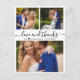 Budget Minimal, Modern, Elegant, skript "Kärlek and tack" Photo Collage Bröllop Tack Postard. Minimalistiskt tack för bröllop, du har en kortmall med tre foto på framsidan och ett foto på baksidan. Med texten "Kärlek och tack" i ett snabbt och välskrivet typografi byts typsnittsskriptet svan ut mot svart färg mot vit bakgrund. Ett litet kärlek hjärta mellan namn. Enkel att anpassa med eget namn och tack för meddelandet. Om du föredrar att skicka anteckningen tar du bara bort exempeltexten för att få mer utrymme. Kontakta mig om du behöver hjälp eller matcha objekt!