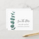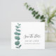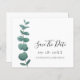Berätta för din familj och dina vänner när din speciella dag är med det här enkla, elegant-, eukalyptus Bröllop spara datum-kortet. Det är dekorerat med vattenfärgen eucalyptus och snyggtens skripttypografi. Enkelt anpassade. Ursprunglig vattenfärg © Michele Davies.