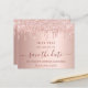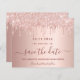 Ett girigt och trendig Spara datum för en Quinceañera, 15:e födelsedagsfesten. En feminin rosa, ro guld faux metallisk tittar bakgrund som dekorerats med ro faux glitter drops från guld, färgdroppstift. Anpassa och lägg till datum och namn/ålder. Texten: Spara datumet skrivs med ett stort trendig-handskript i stil med dekortecken.