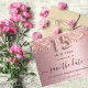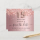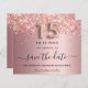 Ett giftigt och trendig Spara datumkortet för en Quinceañera, 15:e födelsedagsfesten. rosa faux metallic tittar bakgrundsdekorerad med faux glitter stoft. Anpassa och lägg till datum och namn/text. Texten: Spara datumet skrivs med ett stort trendig-handskript i stil med dekortecken. Nummer 15 med stil-typsnittet ro guld färgad.