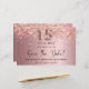 Ett giftigt och trendig Spara datumkortet för en Quinceañera, 15:e födelsedagsfesten. rosa faux metallic tittar bakgrundsdekorerad med faux glitter stoft. Anpassa och lägg till datum och namn/text. Texten: Spara datumet skrivs med ett stort trendig-handskript i stil. Nummer 15 med stil-typsnittet ro guld färgad.