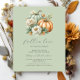 Den här söta babyduschinbjudan innehåller en vattenfärgsbild med två pumpor i pastellskuggor av grönt och orange, med vit och orange blommor, på en grönt. Nedan visas ord "fall i kärlek" i handskript för elegant av kol-grått. Anpassa texten med namn i skript för mamma och detaljerna i tecknet grått sans serif. Perfekt för en gender-neutralt-falldusch.