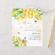 En vit och guldfärgad bakgrund med snyggt. Dekorerad med humla, smälter honung, en honungskomb med blommigtar, blommor och en honung burk. Med texten: Bride ska skrivas med ett modernt handskript i stil med hjärtan. Anpassa och lägg till namn i bruden. 1 lakan = 1 inbjudan tryckt kant till kant.