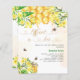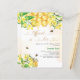 En vit och guldfärgad bakgrund med snyggt. Dekorerad med humla, smälter honung, en honungskomb med blommigtar, blommor och en honung burk. Med texten: Mått att skrivas med ett modernt handskript i stil med hjärtan. Anpassa och lägg till namn i bruden. 1 lakan = 1 inbjudan tryckt kant till kant.