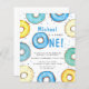 Planerar du en pojkes första födelsedagsfest? Den här söta budgetfödelsedagsinbjudningen är dekorerad med vattenfärgsnötter i pastellskuggor av blått och gult. Enkelt anpassade. Ursprunglig vattenfärg © Michele Davies.