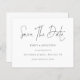Skript QR-kod Bröllop spara datum. Ett budgetmässigt prist mindre än 4,5 x 5,6 tum alternativ. Finns i ett SEMI-GLOSS 110 lb-kort LAGRAR, vilket är standardalternativet (tjockare för inbjudningar), ELLER SATIN AVSLUTAR 80 lb PAPPER LAGRAR (perfekt för bilagor). Enkel elegans med Spara datumet i ett modernt skript.Resten av texten kan du enkelt anpassa. Med din QR-kod till din bröllop webbplats på baksidan. Här visas svart på vitt, men färg och bakgrund kan ändras om du vill med hjälp av alternativet Anpassa ytterligare.