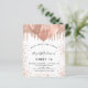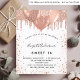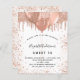För en elegant 16, 16:e födelsedag. En vit bakgrund. Dekorerad med ro guld, faux glitter, målardroppar och ballonger. Anpassa och lägg till information om namn, ålder och party. Namn är skrivet med ett handskript i stil