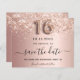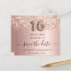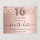 Ett giftigt och trendig Spara datumkortet för en svensk 16, 16:e födelsedagsfest. Metallisk bakgrund i ro-guld tittar dekorerat med ro faux-damm från glitter. Anpassa och lägg till datum och namn/text. Texten: Spara datumet skrivs med ett stort trendig-handskript i stil med dekortecken. Nummer 16 med ett stil-teckensnitt med ballong.