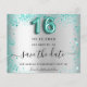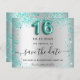 Ett giftigt och trendig Spara datumkortet för en svensk 16, 16:e födelsedagsfest. En faux silver tittar bakgrund som dekoreras med teal, grönt faux glitter stoft. Anpassa och lägg till datum och namn/ålder. Texten: Spara datumet skrivs med ett stort trendig-handskript i stil. Nummer 16 med ett stil-teckensnitt med ballong.