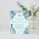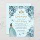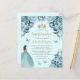 Den här vackra quinceañera-inbjudan innehåller en gräns av turkosa vattenfärgblommor på en blek turkobakgrund. Guld tiara, en mörk-ordförande i en turkos prinsessa-klänning och små turkos-butterflies dekorerar texten. Ord "Quinceañera" och hedersgästens namn visas i handskriftsskriptet för guld-färgad i elegant, med den återstående texten i grått sans serif-teckensnittet.
