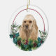 På framsidan av denna Helgdag är ett vackert porträtt av en föraktfull färgad, American Cocker Spain hund som pissar ut från en holly och evergreen bough. Röda bär och gräs-koner dekorerar huggen och gräs sprickor. Bilden placeras på en vit cirkel inom en tunn röd linjekrets. Baksidan av dekoratet har samma vergreka och cirkel med anpassningsbarnas text i rött.