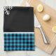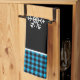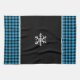 This kitchen towel is shown in a cute black and blue buffalo plaid snowflake print design.