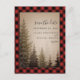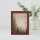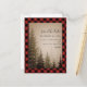 Ett bröllop spara datum med en illustration av evergreen träd över en brun bakgrund med en röd och svart buffel plaid gräns.