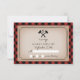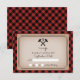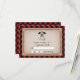En rustic och elegant bröllop r.s.v.p.-inbjudan som innehåller en monogramformad yxkonstruktion och en röd och svart buffelbaksida.