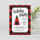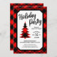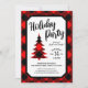 En inbjudan till festlig julfest med en buffel plaid gräns och samordning av träd silhouette.