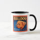 En vintage låda-etikett som illustrerar en bulldog med en blå mönstrad bakgrund och en orange gräns. Välj den här teckningen på din Zazzle-produkt idag.