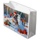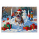 En helgdag med hjärtslitande hund i snö, som bär en julhatt och omges av färgfulla presentlådor. I bakgrunden bygger barn snögubbe bredvid ett Julgran som är täckt av snö och skapar en glatt vinter under. Perfekt för att sprida helgdag och fånga julens magi.