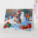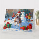 En hjärtvärmande julillustration med en glad hund som leker i snön, bärande en tomtehatt och omgiven av färgglada presentlådor. I bakgrunden bygger barn en snöman bredvid ett snötäckt julgran, vilket skapar en glädjefull vintersaga. Perfekt för att sprida julstämning och fånga julens magi.