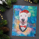 Bull Terrier Ras Hund Jul har en akvarell av en Bull Terrier med en röd tomtehatt, en söt hund jul outfit, och en galax akvarell.