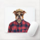 En bullhund bär solglasögon, beige hylsa och en buffelskjorta på vit bakgrund. Bakgrunden till färg kan ändras.