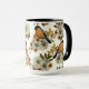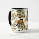 Hand -drawn illustration of a bullfinch bird on bouquet of dahlia, chrysanthemum, berries and branch of autumn leaves.