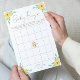 "Cute Gult Bumblebee Baby Shower Bingo Game" är en fin skevt på den klassiska bingo, perfekt skräddarsydd för en babydusch firande. Det här engagerande spelet är utmärkt med charmerande vattenfärgsillustrationer av humlor och gula blommor, inställda mot en mjuk bakgrund som förbättrar händelsens glatta atmosfär. Konstruktionens palett för gender-neutralt gör den till en perfekt som passar för alla babyduschar och bjuder in alla gäster att delta i roligten. När babyduschen dyker upp fyller gästerna i sina bingokort med föremål som de tänkor den blivande föräldern att ta emot som gåvor. När en gåva öppnas som matchar ett objekt på ett kort, stänger gästen av den och lägger till en inslag av förväntan och upphetsning till den presentöppnande processaa. Den första som slutför en linje ropar "Bingo!" och vinner ett pris. Detta spel ger inte bara en lekfull inslag till firande utan uppmuntrar också gästkontakter, skapar babyduschen en minnesvärd och trevlig upplevelse för alla inblandade. Kontaktdesigner för matchande produkter. Visa samling här: https://www.zazzle.com/collections/119052401831044693 Copyright Anastasia Surridge, alla höger reserverade.